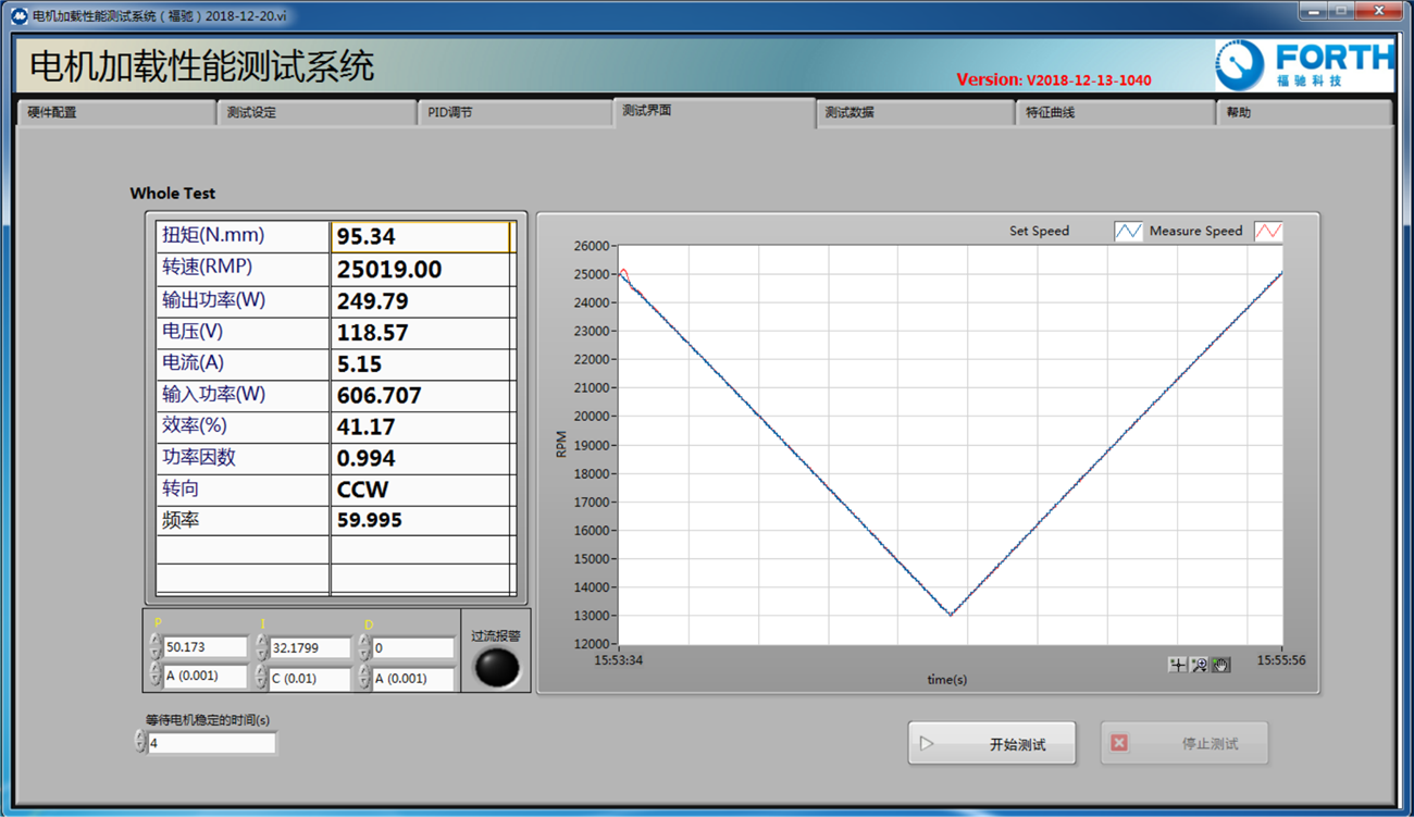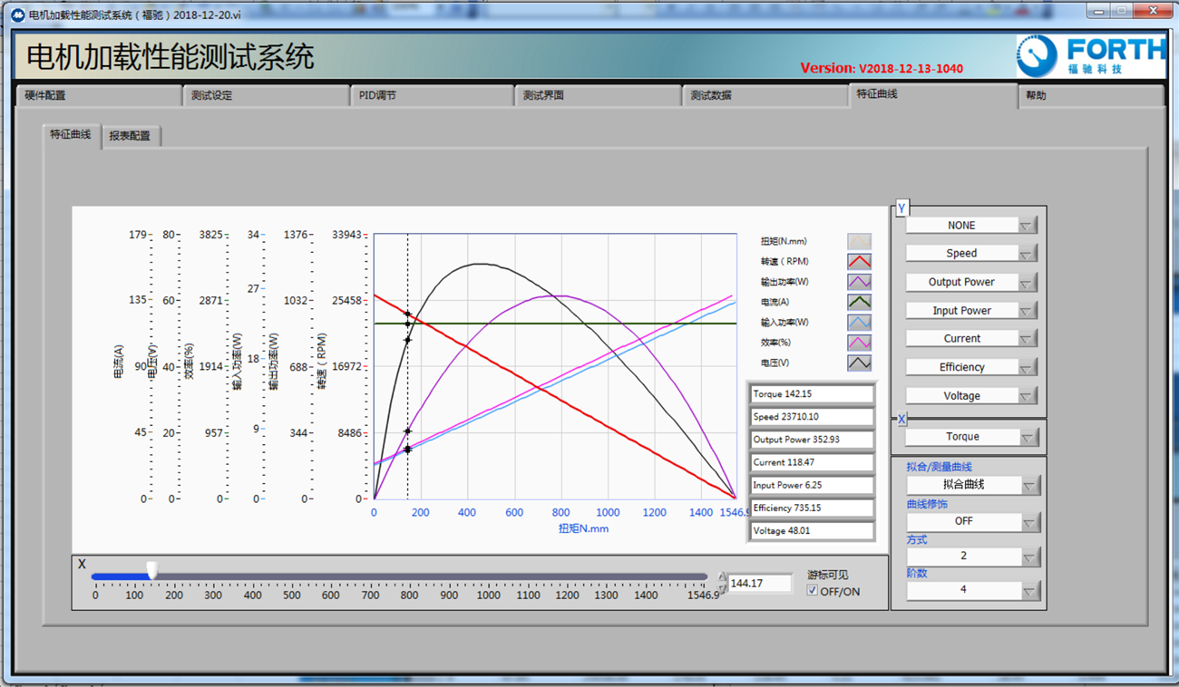 4.測試軟件用LABVIEW編寫, 具有特色的測試與圖形繪制功能,可以計算并顯示多個參數(扭矩, 轉速, 輸出功率,電壓,電流, 輸入功率, 效率, 轉向等)