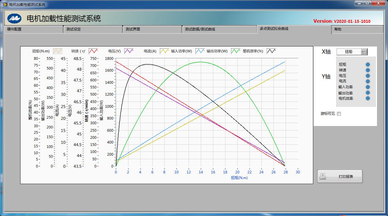 深圳某汽車制造廠定制的水泵電機綜合性能測試系統C0-MTHD284BYD是一套用于測試無刷電機的前端直流電壓、電流、轉速、轉矩、功率p1、p2、p3、效率,以及無刷電機驅動器功率分析。測試結果匯總包含空載點、堵轉點、最大轉矩點、最大輸出點,最大功率點、額定點(用戶自己定義轉矩),本套系統配有3個測功機(300mNm/3Nm/28Nm)且三個測功機之間可以通過轉換器與上位機控制實現自由轉換,通過PA2000mini 功率分析儀采集電機的扭矩轉速及驅動器的輸入輸出電壓電流,軟件是根據客戶的需求進行定制化開發,整套系統交付客戶使用后獲得客戶的高度好評。